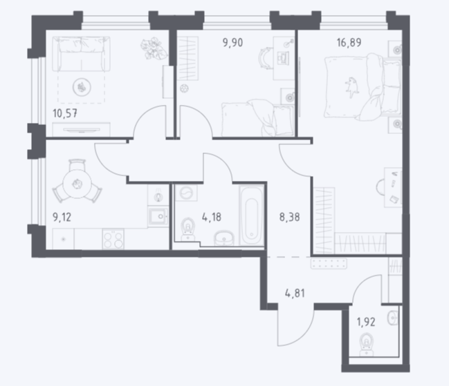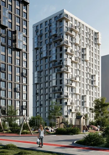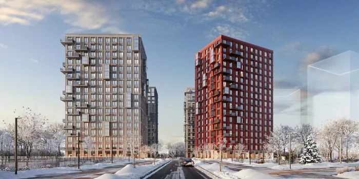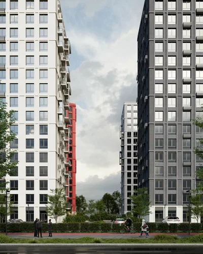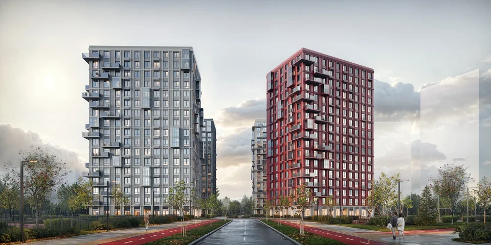 «Рябиновая Роща» — это ваш собственный город с домами высотой от 9 до 17 этажей. В отделке использовали монохромные оттенки с красными акцентами.